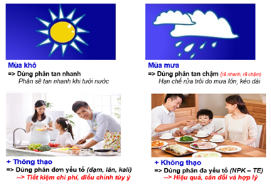 Tốc độ tan, thành phần dưỡng chất cũng ảnh hưởng lớn đến hiệu quả của phân. Mùa khô thường dùng phân tan nhanh, các thành phần bền với nhiệt độ (để giảm thất thoát do nắng). Mùa mưa thường dùng phân tan vừa phải đến chậm và tồn lưu lâu (giảm rửa trôi do mưa).