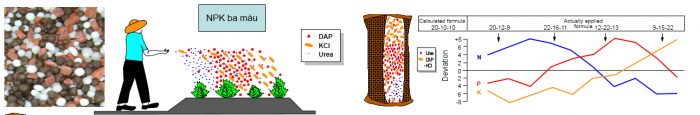 Phân ba màu (NPK hỗn hợp) có ưu điểm là giá thành hạ, nhưng nhược điểm là khối lượng hạt phân khác nhau (khi bón phân bố dinh dưỡng trên diện tích bón không đều), tốc độ tan cũng khác nhau (hàm lượng dinh dưỡng biến động, mất cân đối,…).