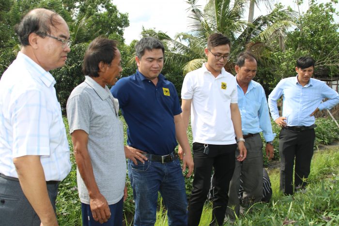 | Ông Lê Văn Chi – Phó Trưởng Phòng NN – PTNT huyện Giồng Riềng cùng Ông Trần Chí Mừng – Phó Trưởng Vùng 2 cùng đoàn cán bộ kỹ thuật công ty và nông dân trồng khoai lang tại khu vực sông Cái Bé. |