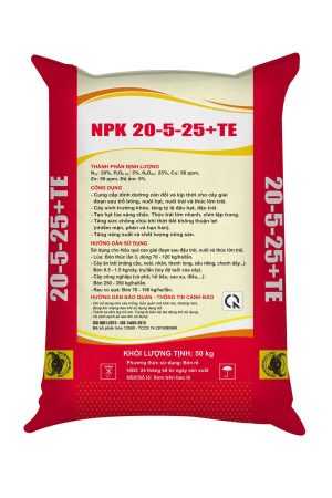 * Thành phần: Nts: 20 %; P2O5hh: 5 %; K2Ohh: 25 %; TE (Cu, Zn): 50 ppm; Độ ẩm:5%