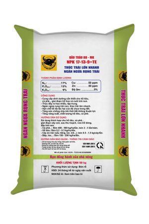 Đạm tổng số (Nts): 17%; Lân hữu hiệu (P2O5hh): 13%; Kali hữu hiệu (K2Ohh): 9%;TE: Đồng (Cu): 50 ppm;Kẽm (Zn): 50 ppm; Độ ẩm: 5%.