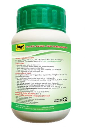 Sử dụng hiệu quả cho các loại cây trồng giai đoạn cây con, phát triển cành lá, nuôi trái non và sau thu hoạch. Pha 10 ml/8-10 lít nước, phun định kỳ 7-10 ngày/lần.