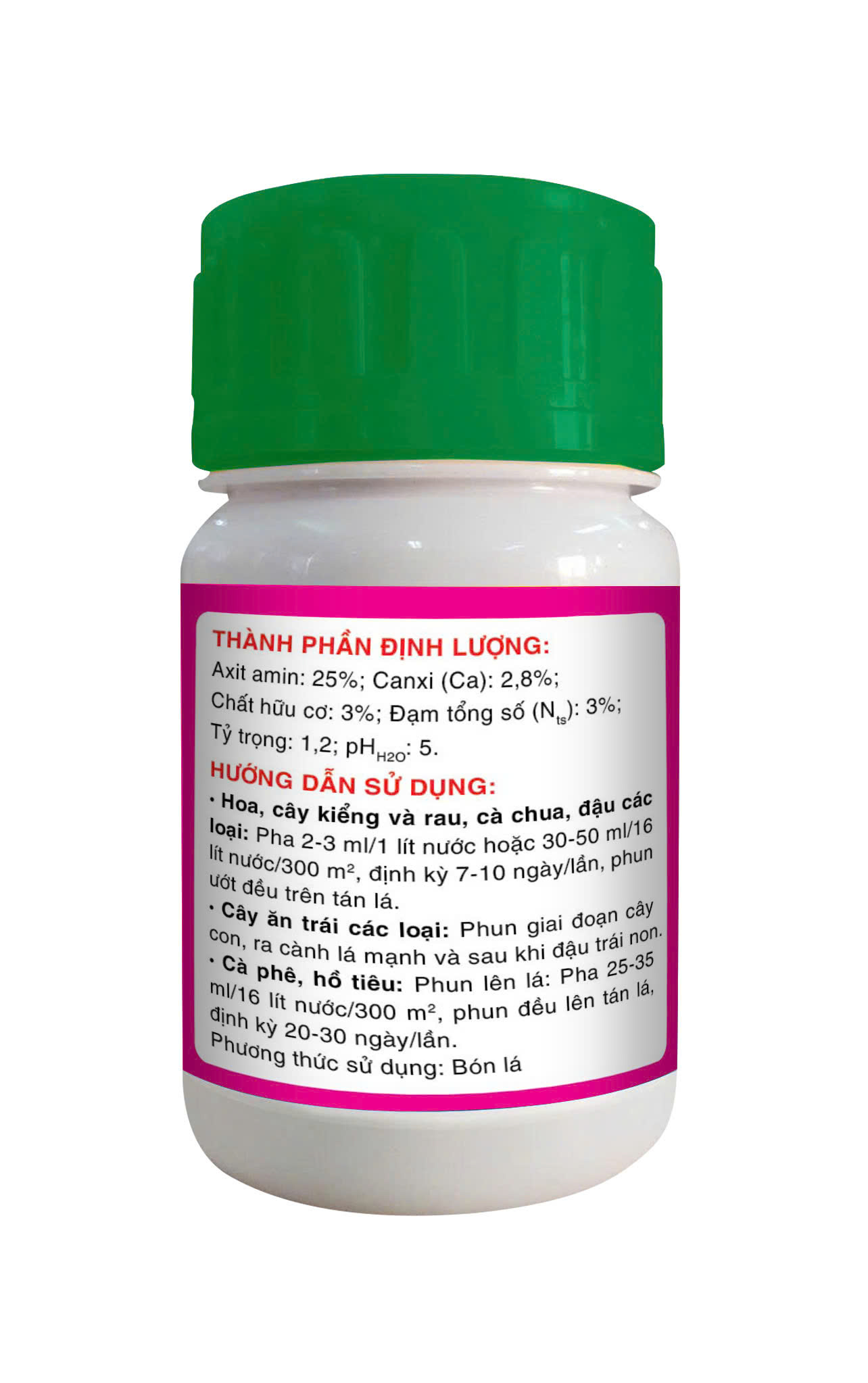 - Hoa, cây kiếng và rau, cà chua, đậu các loại: Pha 2-3 ml/1 lít nước hoặc 30-50 ml/16 lít nước/300 m², định kỳ 7-10 ngày/lần, phun ướt đều trên tán lá.