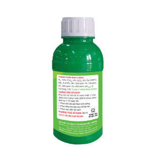 Nts 10%; P2O5hh 8%; K2Ohh 6%; Ca 0,007%; Mg 0,018%; Mn 200ppm; Fe 100ppm; Zn 200ppm; Cu 200ppm; pHH2O 5; Tỷ trọng 1,15