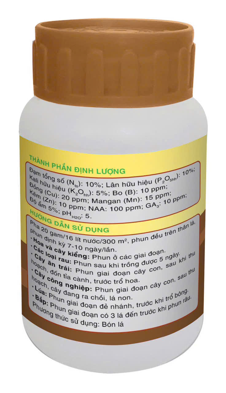 * Thành phần: Nts: 10 %, P2O5hh: 10 %, K2Ohh: 5 %, BO (B): 10 ppm, Đồng (Cu): 20 ppm, Mangan (Mn): 15 ppm, Kẽm (Zn): 10 ppm, NAA: 100 ppm, GA3: 10 ppm, Độ ẩm: 5%; pHH2O: 5.